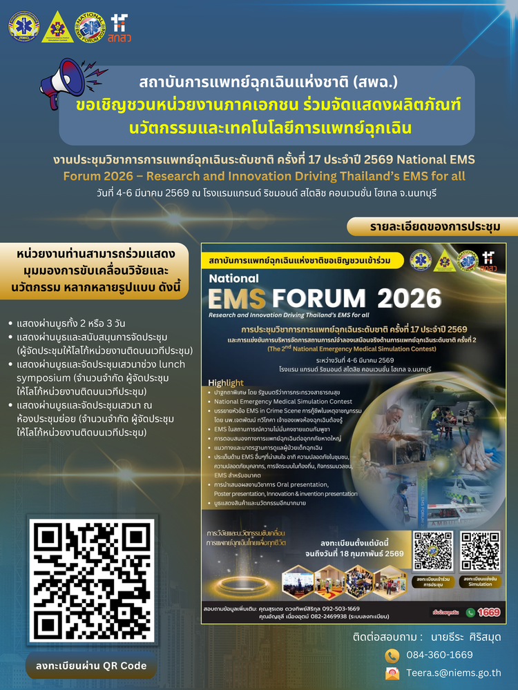 สถาบันการแพทย์ฉุกเฉินแห่งชาติ (สพฉ.) เชิญหน่วยงานภาคเอกชน ผู้ประกอบการ และผู้พัฒนาเทคโนโลยีด้านการแพทย์ฉุกเฉิน ร่วมจัดแสดงผลิตภัณฑ์และนวัตกรรม ในงาน ประชุมวิชาการการแพทย์ฉุกเฉินระดับชาติ ครั้งที่ 17 ประจำปี 2569 (National EMS Forum 2026) ภายใต้แนวคิด “Research and Innovation Driving Thailand’s EMS for All”