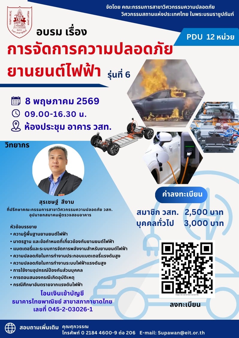 #EV #รถยนต์ไฟฟ้า #EVSafety #ความปลอดภัยEV #ยานยนต์ไฟฟ้า #FireSafety #HighVoltageSafety #EVFire #EVTraining #วิศวกรรมยานยนต์ #วิศวกร #เจ้าหน้าที่ความปลอดภัย #EIT #วสท #หลักสูตรอบรม #อบรมวิศวกรรม #เทคโนโลยียานยนต์ #EVThailand #MReportTH #IndustryNews