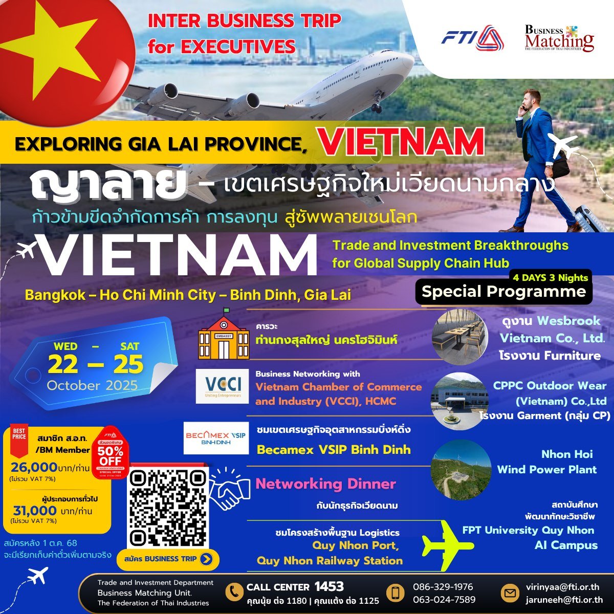 สภาอุตสาหกรรมแห่งประเทศไทย (ส.อ.ท.) ขอเชิญชวนผู้บริหารระดับสูงและนักธุรกิจที่สนใจเจาะตลาดเวียดนาม เข้าร่วมกิจกรรม "Inter Business Trip for Executives" เปิดมุมมองใหม่สู่เขตเศรษฐกิจเกิดใหม่ของเวียดนามกลาง จังหวัด ญาลาย ที่กำลังเติบโตอย่างรวดเร็ว