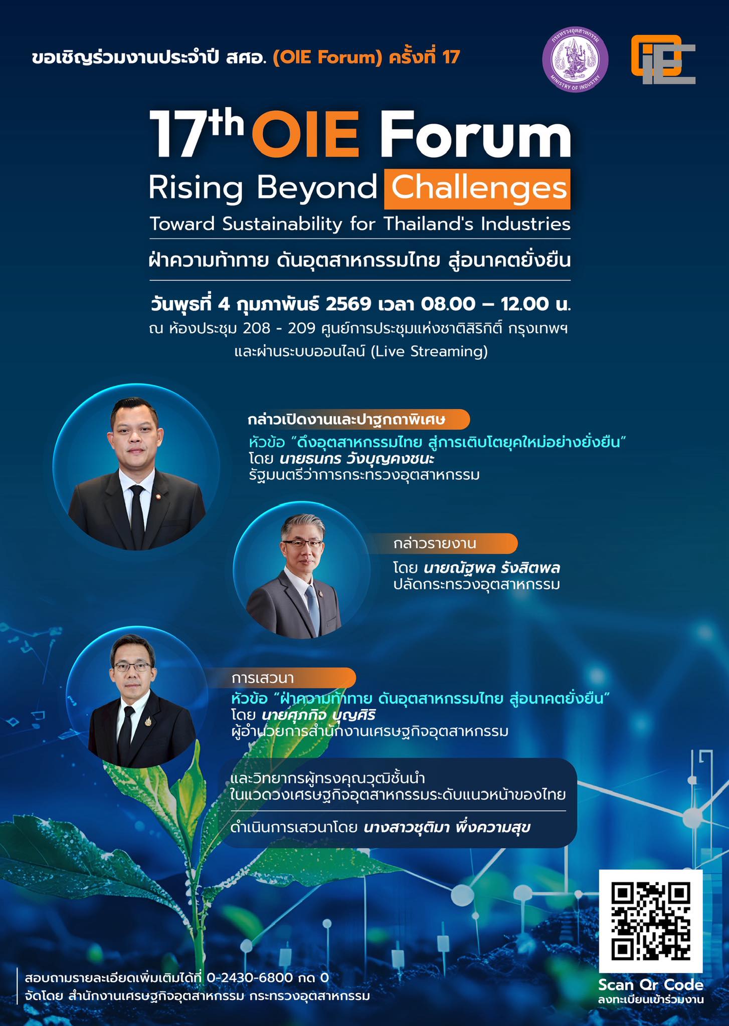 สำนักงานเศรษฐกิจอุตสาหกรรม (สศอ.) ผนึกกำลังภาครัฐและภาคเอกชน จัดงาน OIE Forum ครั้งที่ 17 ภายใต้หัวข้อ “Rising Beyond Challenges: Toward Sustainability for Thailand's Industries” เปิดเวทีแลกเปลี่ยนมุมมองเชิงนโยบายและแนวทางรับมือความท้าทาย เพื่อขับเคลื่อนอุตสาหกรรมไทยสู่การเติบโตอย่างยั่งยืนในระยะยาว