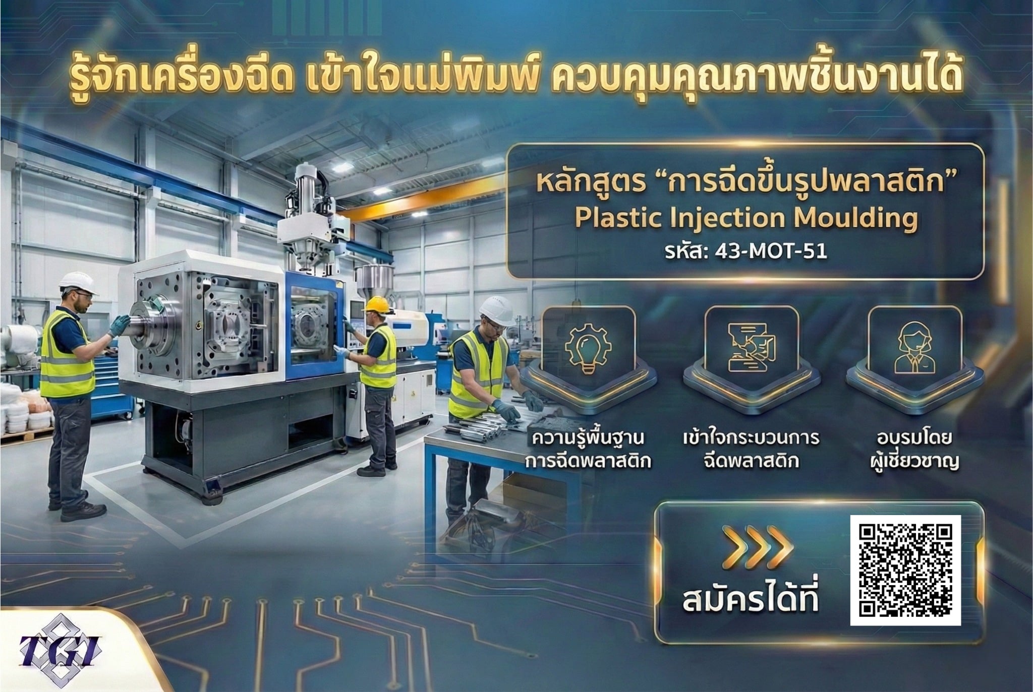สถาบันไทย-เยอรมัน (TGI) เปิดอบรมหลักสูตร “การฉีดขึ้นรูปพลาสติก (Injection Molding) ระดับ Basic” ระหว่างวันที่ 8–9 เมษายน 2569 ณ นิคมอุตสาหกรรมอมตะซิตี้ ชลบุรี มุ่งพัฒนาความรู้พื้นฐานด้านกระบวนการฉีดพลาสติก ตั้งแต่สมบัติของวัสดุ เครื่องจักร ไปจนถึงพารามิเตอร์สำคัญ เช่น Clamping Force, Injection Pressure, Injection Speed และ Switch Over Point เพื่อเพิ่มประสิทธิภาพการผลิตและลดข้อผิดพลาดในงานอุตสาหกรรม
