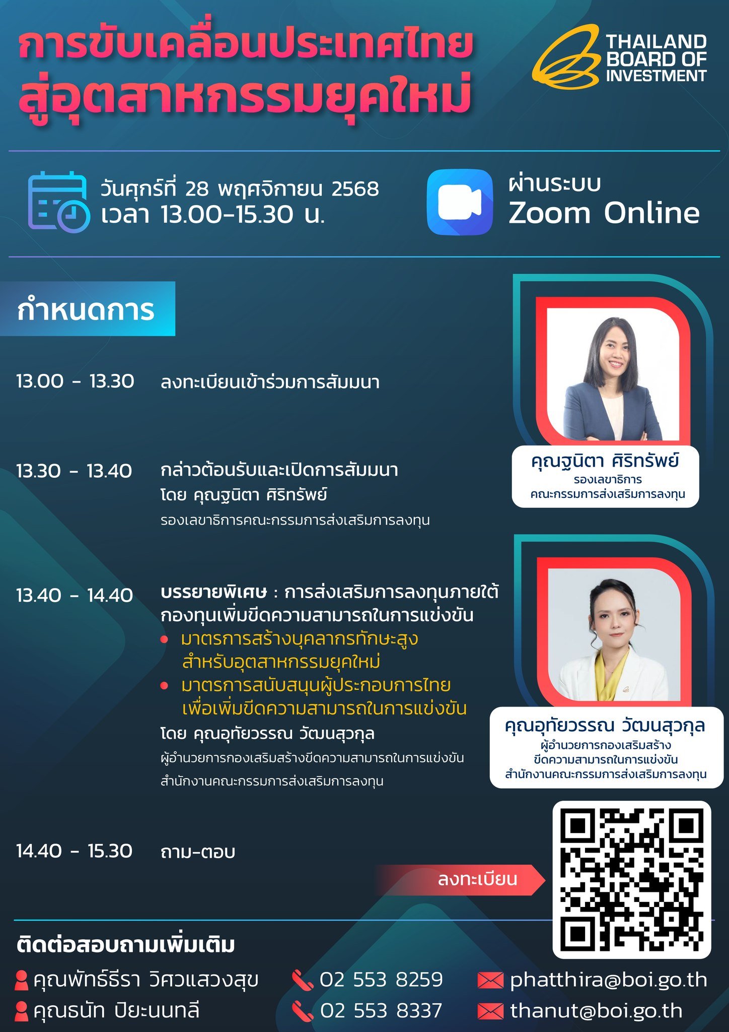 กระทรวงอุตสาหกรรมเชิญผู้ประกอบการไทย ผู้บริหารองค์กร และผู้สนใจ เข้าร่วมสัมมนาออนไลน์หัวข้อ “การขับเคลื่อนประเทศไทยสู่อุตสาหกรรมยุคใหม่” เปิดมุมมองและแนวทางเตรียมความพร้อมต่อการเปลี่ยนผ่านอุตสาหกรรมไทยสู่ความยั่งยืน พร้อมอัปเดตมาตรการสนับสนุนที่ภาคธุรกิจสามารถเข้าถึงได้จริง เข้าร่วมได้ ฟรี ไม่มีค่าใช้จ่าย ผ่านระบบ Zoom Meeting