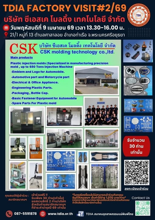 สมาคมอุตสาหกรรมแม่พิมพ์ไทย (TDIA) เชิญสมาชิกเข้าร่วมกิจกรรม Factory Visit ครั้งที่ 2/2569 เยี่ยมชมกระบวนการผลิตและเทคโนโลยีของ CSK Molding Technology Co., Ltd. ณ จังหวัดพระนครศรีอยุธยา พร้อมเปิดโอกาสให้ผู้ประกอบการแลกเปลี่ยนความรู้ เสริมเครือข่าย และอัปเดตเทรนด์อุตสาหกรรมแม่พิมพ์อย่างใกล้ชิด