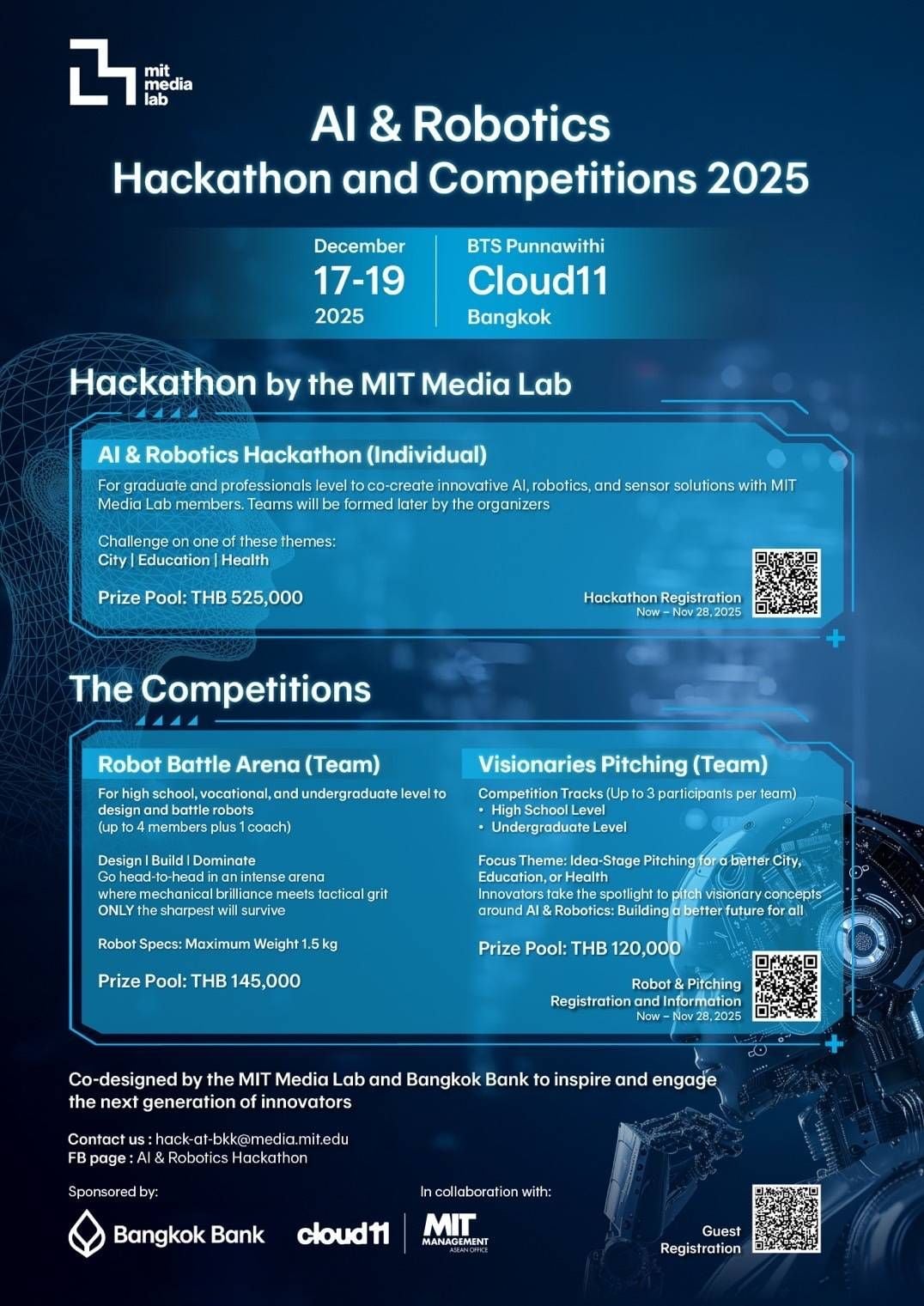 งาน AI & Robotics Hackathon and Competition 2025 โดย MIT Media Lab ร่วมกับ ธนาคารกรุงเทพ กลับมาเปิดเวทีให้นักศึกษา เยาวชน และผู้สนใจด้านเทคโนโลยี ได้พัฒนาไอเดียสู่ผลงานจริง ผ่านกิจกรรมโชว์นวัตกรรม การประกวด Visionaries Pitching และการแข่งขัน Robot Battle Arena พร้อมเงินรางวัลรวมกว่า 265,000 บาท