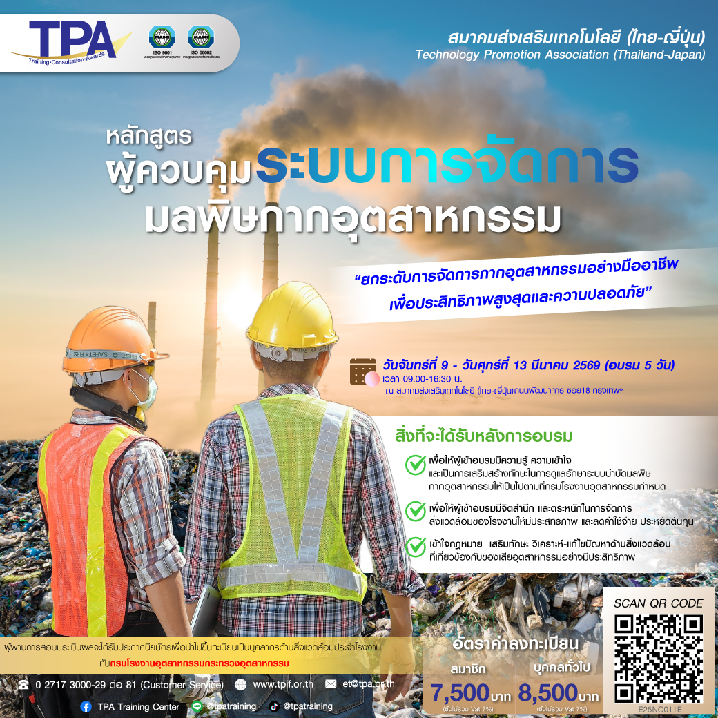 สมาคมส่งเสริมเทคโนโลยี (ไทย-ญี่ปุ่น) หรือ สสท. เปิดรับสมัครอบรมหลักสูตร “ผู้ควบคุมระบบการจัดการมลพิษกากอุตสาหกรรม” รุ่นที่ 47 เพื่อเสริมสร้างความรู้และทักษะด้านการจัดการกากอุตสาหกรรมให้แก่ผู้ประกอบการ วิศวกร และบุคลากรด้านสิ่งแวดล้อมในโรงงานอุตสาหกรรม โดยหลักสูตรครอบคลุมทั้งภาคทฤษฎีและการปฏิบัติจริง สอดคล้องตามข้อกำหนดของกรมโรงงานอุตสาหกรรม พร้อมรองรับการขึ้นทะเบียนเป็นบุคลากรด้านสิ่งแวดล้อมประจำโรงงานอย่างถูกต้อง