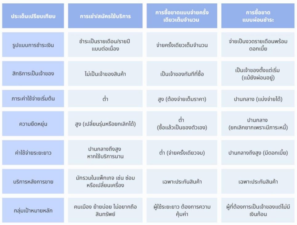 รูปแบบธุรกิจการเช่าหรือสมัครใช้บริการแตกต่างจากการซื้อขาดทั้งแบบจ่ายครั้งเดียวและแบบผ่อนชำระอย่างชัดเจน โดย Subscription เน้นการจ่ายค่าบริการต่อเนื่อง ผู้บริโภคไม่ต้องเป็นเจ้าของสินค้าแต่ได้รับสิทธิการใช้งานพร้อมบริการหลังการขาย ส่งผลให้มีค่าใช้จ่ายเริ่มต้นต่ำ มีความยืดหยุ่นสูง และลดความเสี่ยงด้านการซ่อมบำรุง เหมาะกับผู้บริโภคที่ให้ความสำคัญกับความคล่องตัว ไม่ต้องการเป็นเจ้าของสินทรัพย์ในระยะยาว และต้องการควบคุมต้นทุนตลอดอายุการใช้งาน