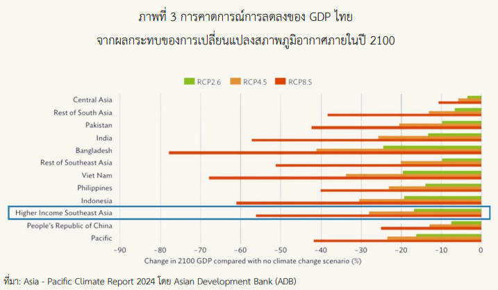 ความพยายามของไทยในการเร่งลดการปล่อยก๊าซเรือนกระจกเพื่อมุ่งสู่เศรษฐกิจคาร์บอนต่ำก่อให้เกิดทั้งความท้าทายและโอกาสเชิงยุทธศาสตร์สำคัญต่อการพัฒนาประเทศ ในด้านหนึ่ง ไทยยังคงเผชิญข้อจำกัดเชิงโครงสร้างหลายประการ ไม่ว่าจะเป็นต้นทุนการลงทุนที่สูง โดยเฉพาะในส่วนของเทคโนโลยีดิจิทัล เทคโนโลยีพลังงานสะอาด โครงสร้างพื้นฐานที่จำเป็นต่อการเปลี่ยนผ่าน รวมถึงความต้องการบุคลากรที่มีทักษะทางเทคนิคขั้นสูง และความจำเป็นในการประสานการดำเนินงานอย่างมีเอกภาพระหว่างหน่วยงานภาครัฐ ภาคเอกชน และภาคส่วนที่เกี่ยวข้อง เมื่อพิจารณาปัจจัยจำกัดดังกล่าว จึงเกิดความกังวลเกี่ยวกับผลกระทบทางเศรษฐกิจที่อาจเกิดขึ้นจากมาตรการลดการปล่อยก๊าซเรือนกระจก โดยงานวิจัยของ Asian Development Bank (ADB) (ภาพที่ 3) ได้วิเคราะห์ว่า หากไม่สามารถจำกัดการเปลี่ยนแปลงของสภาพภูมิอากาศได้ คาดว่า ในปี 2100 GDP ไทยจะลดลงถึงร้อยละ 56 ภายใต้สถานการณ์จำลองการปล่อยมลพิษระดับสูง แต่หากสามารถจํากัดอุณหภูมิเฉลี่ยของโลกให้สูงขึ้นไม่เกิน 2 องศาเซลเซียสตามข้อตกลงปารีสได้ GDP ไทยจะลดลงเพียงร้อยละ 17 เมื่อเทียบกับสถานการณ์การดำเนินธุรกิจตามปกติ (Business as Usual:BAU)