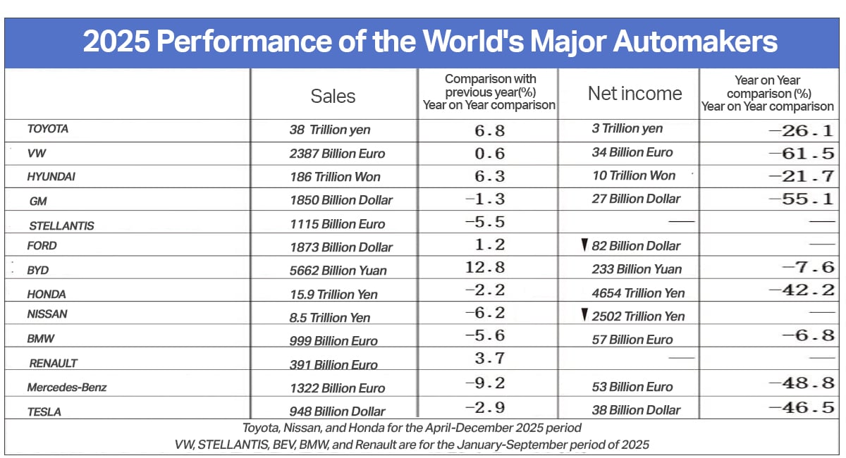 ทางด้าน Hyundai Motor Company แม้กำไรจะลดลงจากแรงกดดันด้านภาษี แต่สามารถทำยอดขายรวมสูงสุดเป็นประวัติการณ์ โดยได้รับแรงหนุนจากยอดขายรถยนต์ไฮบริดที่เติบโตเกือบ 30% และมีสัดส่วนเกิน 15% ของยอดขายรวมทั่วโลก