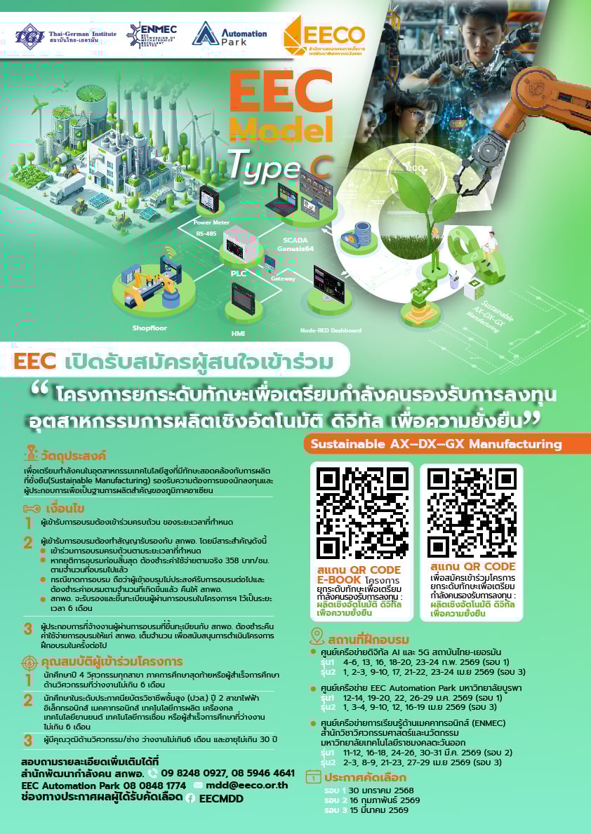 สำนักงานคณะกรรมการส่งเสริมเขตพัฒนาพิเศษภาคตะวันออก (EEC) เปิดรับสมัครผู้สนใจเข้าร่วม โครงการยกระดับทักษะกำลังคนรองรับอุตสาหกรรมการผลิตยุคใหม่ “Sustainable AX–DX–GX Manufacturing” มุ่งเสริมทักษะด้าน ระบบอัตโนมัติ ดิจิทัล และโรงงานอัจฉริยะ ผ่านการฝึกอบรมเชิงปฏิบัติจริง ใช้อุปกรณ์จริง ไม่มีค่าใช้จ่าย เพื่อเตรียมบุคลากรคุณภาพรองรับการลงทุนอุตสาหกรรมเป้าหมายในพื้นที่ EEC และระดับประเทศ