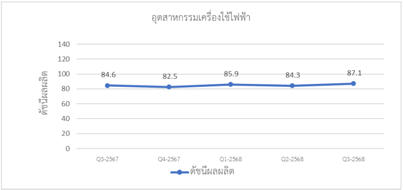 การผลิตสินค้าเครื่องใช้ไฟฟ้าในไตรมาสที่ 3 ปี 2568 ขยายตัวร้อยละ 3.0 เมื่อเทียบกับช่วงเดียวกันของปีก่อน สะท้อนการฟื้นตัวของอุปสงค์ในกลุ่มเครื่องใช้ไฟฟ้าและอุปกรณ์อิเล็กทรอนิกส์สำหรับบ้านอัจฉริยะ (Smart Appliance) โดยเฉพาะในช่วงเตรียมเข้าสู่ฤดูกาลจำหน่ายปลายปี ส่งผลให้ผู้ประกอบการเร่งการผลิตสินค้า อาทิ เครื่องปรับอากาศ หม้อแปลงไฟฟ้า และพัดลม เพื่อรองรับความต้องการของตลาด