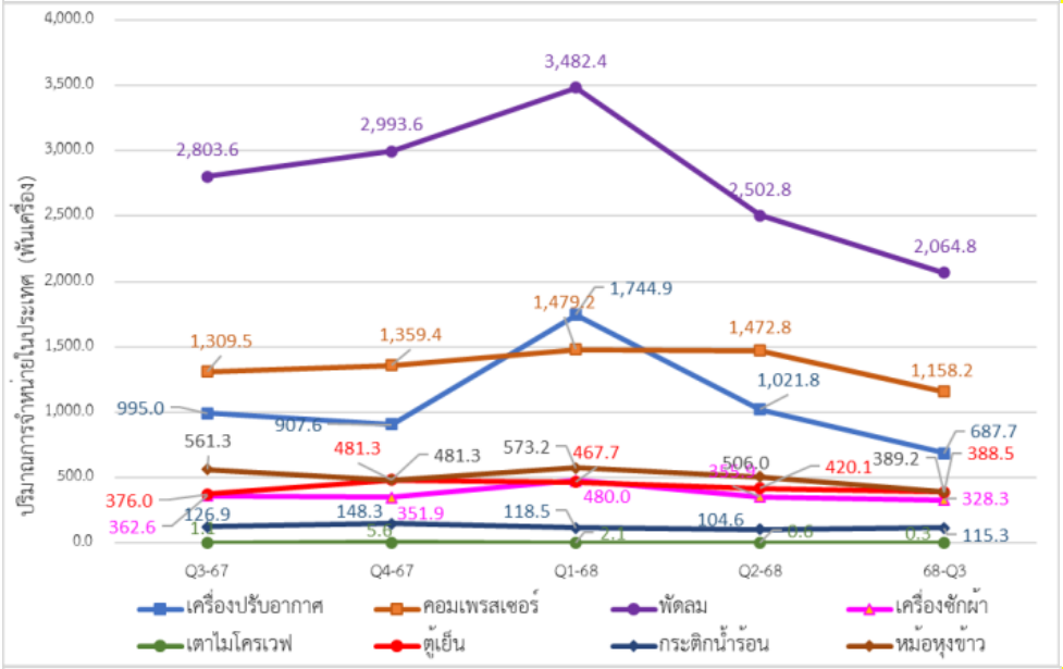 - ไตรมาสที่ 3 ปี 2568 สินค้าที่มีการปรับตัวลดลงเมื่อเทียบกับไตรมาสเดียวกันของปีก่อน เช่น เครื่องปรับอากาศ คอมเพรสเซอร์และเครื่องซักผ้า ลดลงร้อยละ 32.7, 21.6 และ 7.7 ตามลำดับ