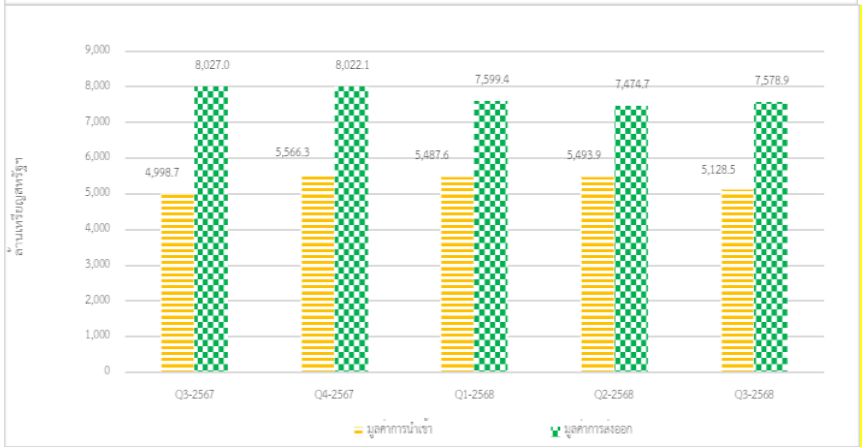 - ไตรมาสที่ 3 ปี 2568 มีมูลค่า 5,128.5 ล้านเหรียญสหรัฐฯ ลดลงจากไตรมาสที่แล้วร้อยละ 6.7 (%QoQ) แต่เพิ่มขึ้นจากไตรมาสเดียวกันของปีก่อนร้อยละ 2.6 (%YoY)