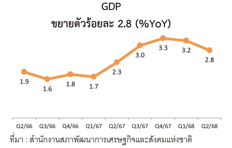 ผลิตภัณฑ์มวลรวมในประเทศ (GDP) ไตรมาส 2 ปี 2568 ขยายตัว 2.8% ชะลอลงจากไตรมาสก่อนที่ขยายตัว 3.2% แต่ยังเพิ่มขึ้นเมื่อเทียบกับช่วงเดียวกันของปีก่อน
