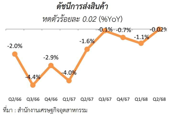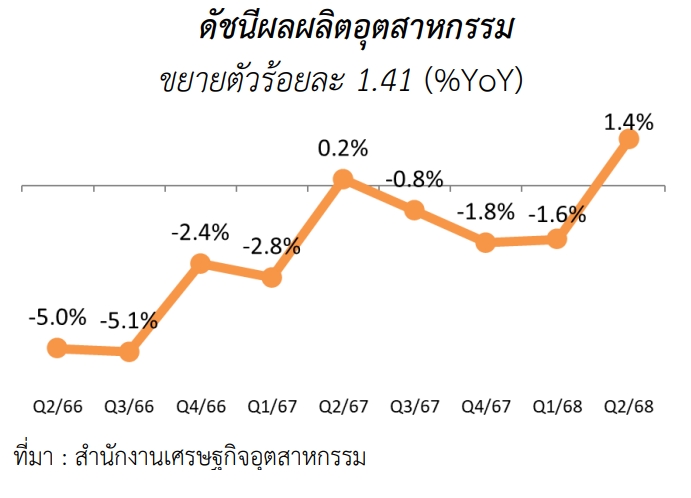รายงานภาวะเศรษฐกิจอุตสาหกรรมไทยไตรมาสที่ 2 ปี 2568 พิจารณาจากดัชนีผลผลิตอุตสาหกรรม (MPI) มีค่าอยู่ที่ 96.75 ขยายตัวร้อยละ 1.47 เมื่อเปรียบเทียบกับไตรมาสเดียวกันของปีก่อน ซึ่งเป็นการกลับมาขยายตัวหลังจากที่หดตัวติดต่อกันเป็นเวลา 3 ไตรมาส นับตั้งแต่ไตรมาสที่ 3 ปี 2567 ทั้งนี้ อุตสาหกรรมที่มีการขยายตัวในไตรมาสที่ 2 ปี 2568 อาทิ ยานยนต์ จากสินค้ารถยนต์ไฮบริด, รถยนต์ไฟฟ้า และรถบรรทุกปิคอัพ เป็นหลัก