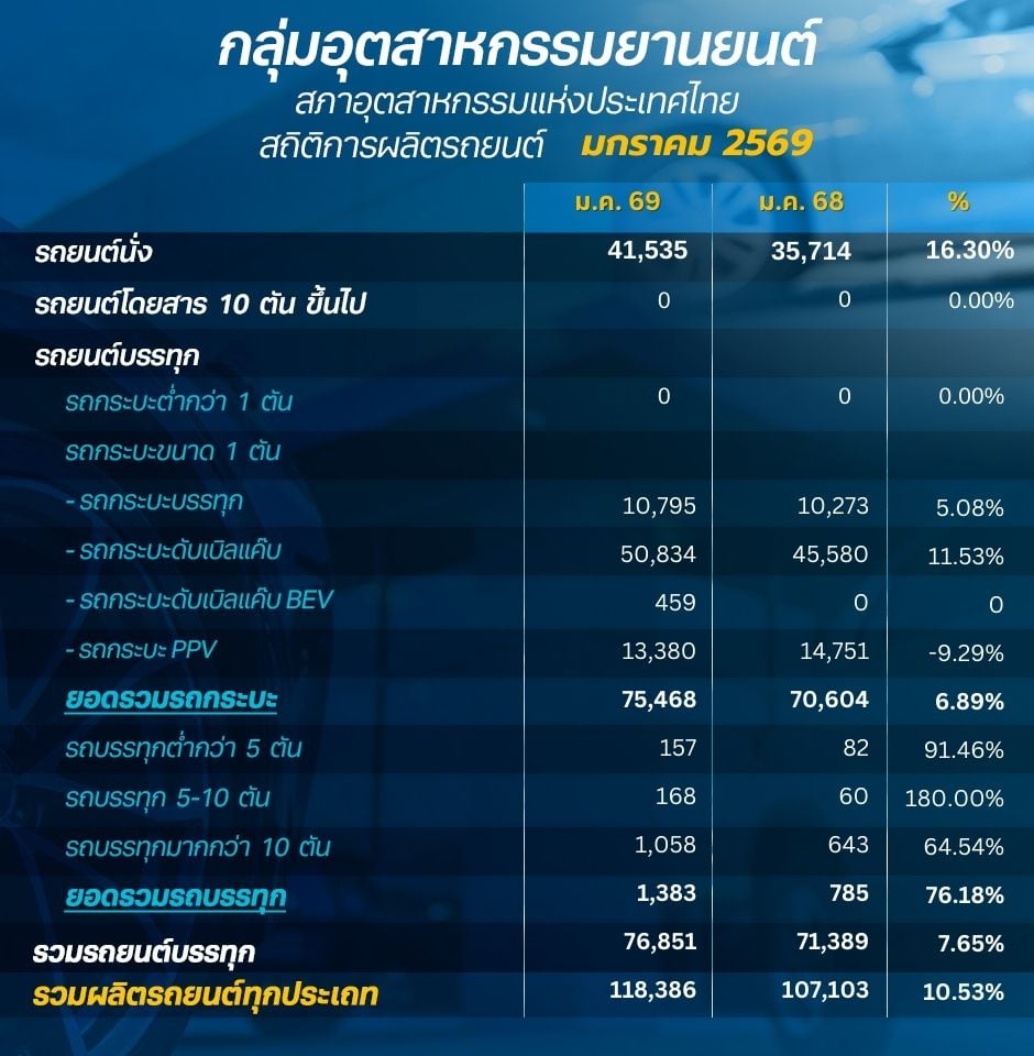 ยอดผลิตรถยนต์ไทย ม.ค. 2569 โต 10.53% รถนั่งส่งออกพุ่ง-กระบะในประเทศฟื้น