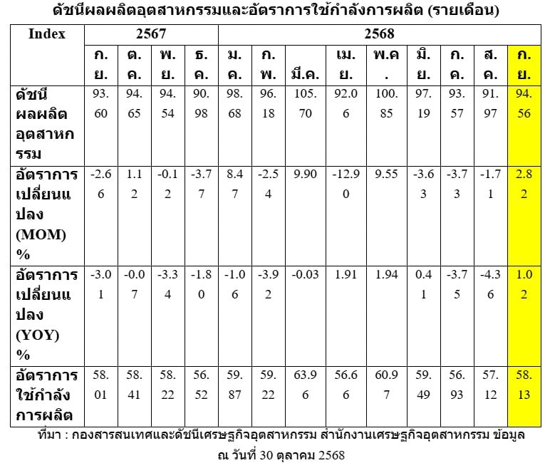 30 ตุลาคม 2568 — นายศุภกิจ บุญศิริ ผู้อำนวยการสำนักงานเศรษฐกิจอุตสาหกรรม (สศอ.) เปิดเผยว่า ดัชนีผลผลิตอุตสาหกรรม (MPI) เดือนกันยายน 2568 อยู่ที่ระดับ 94.56 ขยายตัวร้อยละ 1.02 เมื่อเทียบกับช่วงเดียวกันของปีก่อน ขณะที่อัตราการใช้กำลังการผลิตอยู่ที่ร้อยละ 58.13 เนื่องจากยอดขายยานยนต์ไฟฟ้าที่เพิ่มขึ้น การผลิตรถยนต์กลับมาขยายตัวอีกครั้งอยู่ที่ร้อยละ 5.57 เมื่อเทียบกับช่วงเดียวกันของปีก่อน รวมถึงการท่องเที่ยวของคนในประเทศขยายตัวเนื่องจากโครงการเที่ยวไทยคนละครึ่ง 2568 ประกอบกับมาตรการกระตุ้นเศรษฐกิจ เช่น การปรับลดค่าไฟฟ้าและโครงการคุณสู้เราช่วยเฟส 2 เป็นต้น ขณะที่ ภาพรวมดัชนีผลผลิตอุตสาหกรรม ไตรมาส 3 ปี 2568 อยู่ที่ระดับ 93.36 หดตัวร้อยละ 2.40 เมื่อเทียบกับช่วงเดียวกันของปีก่อน และอัตราการใช้กำลังการผลิตอยู่ที่ร้อยละ 57.39