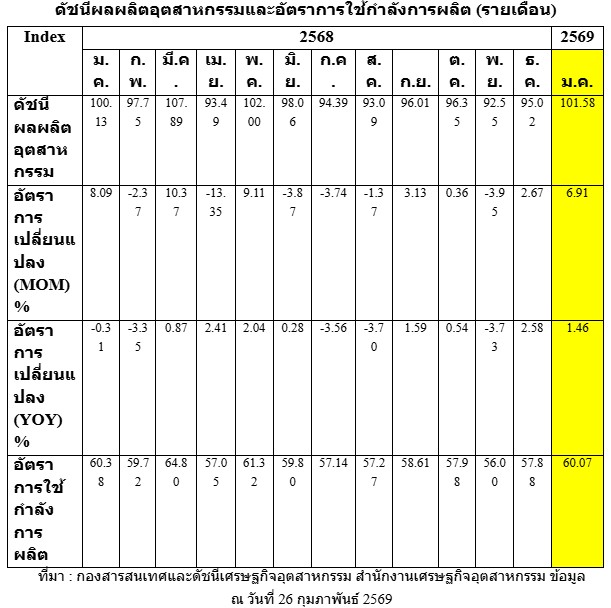 26 กุมภาพันธ์ 2569 — ศุภกิจ บุญศิริ ผู้อำนวยการ สำนักงานเศรษฐกิจอุตสาหกรรม (สศอ.) เปิดเผยว่า ดัชนีผลผลิตอุตสาหกรรม (MPI) เดือนมกราคม 2569 อยู่ที่ระดับ 101.58 ขยายตัวร้อยละ 1.46 เมื่อเทียบกับช่วงเดียวกันของปีก่อน ขณะที่อัตราการใช้กำลังการผลิตอยู่ที่ร้อยละ 60.07