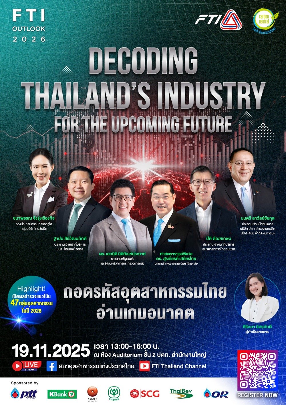 สภาอุตสาหกรรมแห่งประเทศไทย (ส.อ.ท.) ขอเชิญร่วมงานสัมมนาใหญ่ “FTI Outlook 2026: DECODING THAILAND’S INDUSTRY FOR THE UPCOMING FUTURE” เวทีสำคัญที่รวมผู้เชี่ยวชาญและผู้นำภาคอุตสาหกรรมมาร่วมถอดรหัสแนวโน้มเศรษฐกิจไทย–โลก พร้อมเปิดมุมมองและกลยุทธ์ธุรกิจใหม่เพื่อเตรียมรับมือความเปลี่ยนแปลงในปี 2569 และอนาคตข้างหน้า