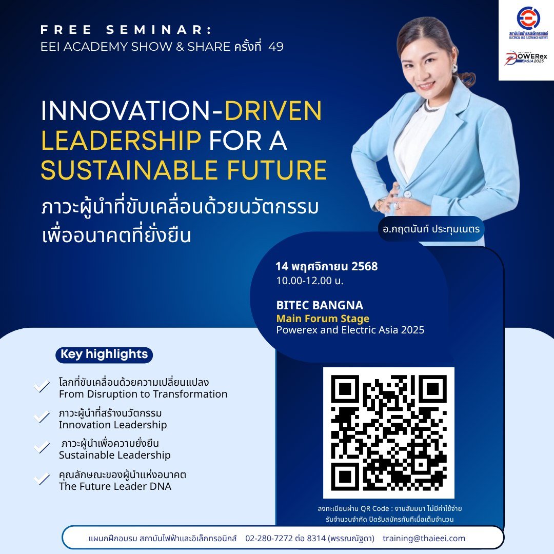 สถาบันไฟฟ้าและอิเล็กทรอนิกส์ (EEI) ขอเชิญผู้บริหาร ผู้จัดการ บุคลากรฝ่ายพัฒนาองค์กร และผู้สนใจ เข้าร่วมสัมมนาพิเศษ “Innovation-Driven Leadership for a Sustainable Future” ที่จะเปิดโลกทัศน์ใหม่ของการเป็นผู้นำยุคใหม่อย่างรอบด้าน