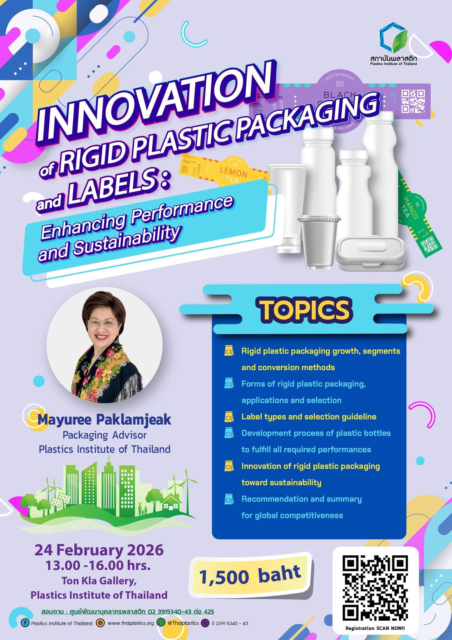 สถาบันพลาสติก เชิญผู้ประกอบการ นักออกแบบบรรจุภัณฑ์ และบุคลากรในสายการผลิต เข้าร่วมอบรมสัมมนา “Update Trends Packaging: Innovation of Rigid Plastic Packaging and Labels – Enhancing Performance and Sustainability” เพื่ออัปเดตทิศทางใหม่ของบรรจุภัณฑ์พลาสติกคงรูปและฉลาก ซึ่งมีบทบาทสำคัญต่อการแข่งขันทางธุรกิจในยุคที่ทั้งประสิทธิภาพ ฟังก์ชันการใช้งาน และความยั่งยืน ต้องดำเนินไปควบคู่กัน