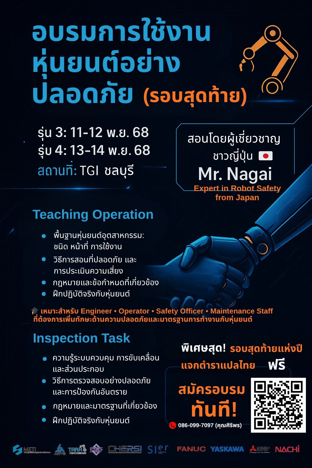 #TGI #สถาบันไทยเยอรมัน #TARA #สมาคมส่งเสริมความปลอดภัยอัตโนมัติ #JapanTraining #METI #AOTS #JARSIA #FANUC #Yaskawa #Mitsubishi #Nachi #IndustrialRobot #AutomationThailand #MReportTH #IndustryNews