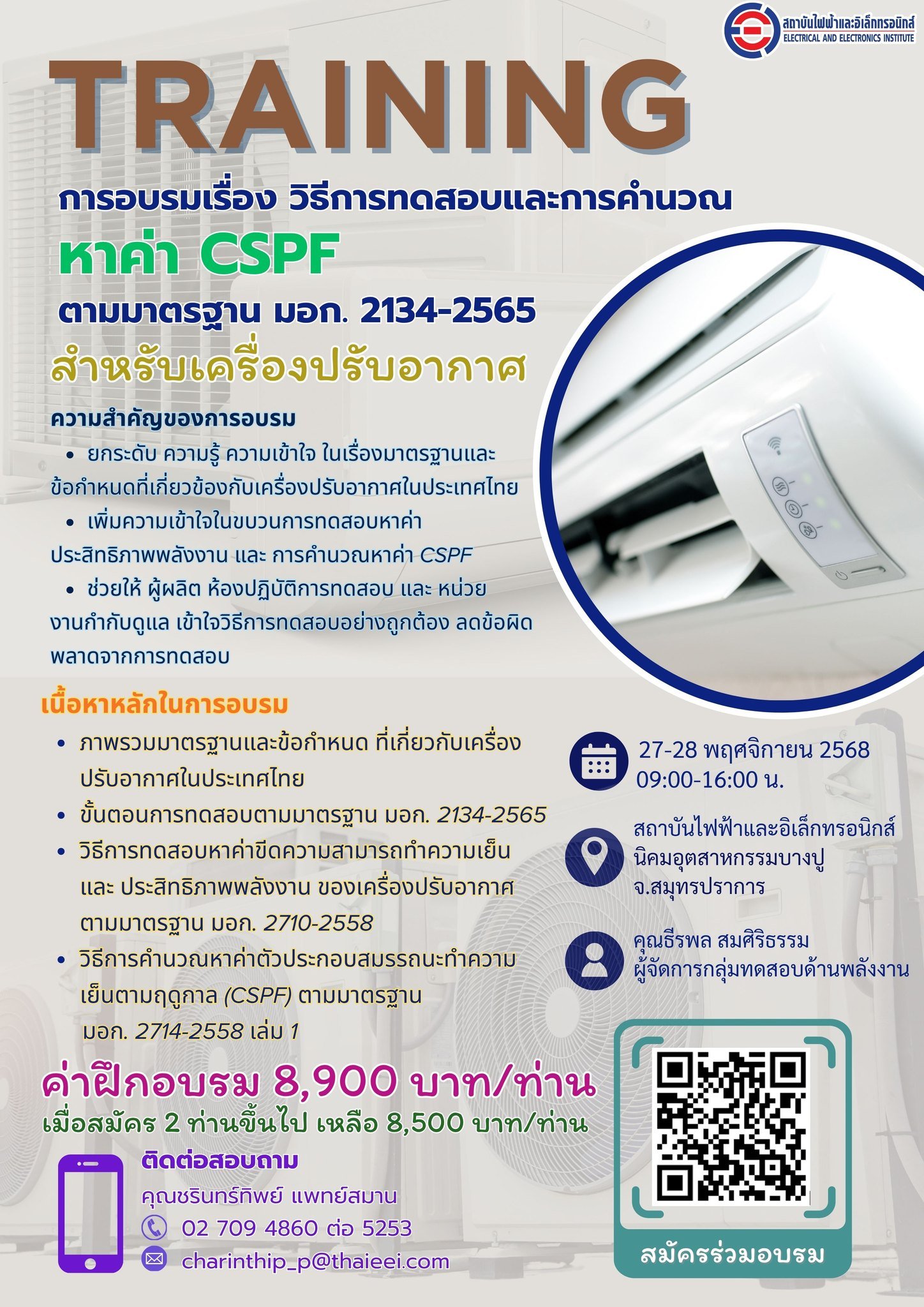 สถาบันไฟฟ้าและอิเล็กทรอนิกส์ (EEI) ขอเชิญวิศวกร นักเทคนิค และผู้ประกอบการในอุตสาหกรรมเครื่องปรับอากาศ เข้าร่วมอบรมหลักสูตร “วิธีการทดสอบและการคำนวณหาค่า CSPF (Cooling Seasonal Performance Factor)” ตามมาตรฐานผลิตภัณฑ์อุตสาหกรรม มอก. 2134-2565 เพื่อยกระดับความรู้และทักษะการประเมินประสิทธิภาพพลังงานของเครื่องปรับอากาศให้เป็นไปตามมาตรฐานสากล