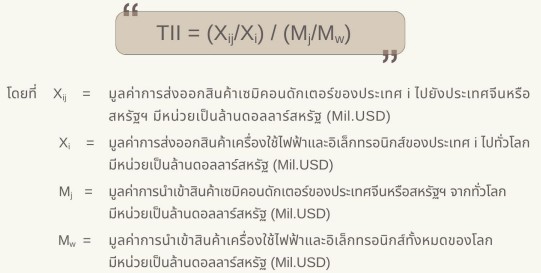 สำหรับดัชนี TII นั้น เป็นดัชนีที่ใช้วัดระดับความเข้มข้นของความสัมพันธ์ทางการค้าระหว่างประเทศหนึ่งกับอีกประเทศหนึ่ง หรือประเทศผู้ส่งออกกับประเทศคู่ค้ามีระดับการค้าเข้มข้นมากน้อยเพียงใด โดยเปรียบเทียบสัดส่วนการค้าระหว่างสองประเทศกับสัดส่วนการค้าโลก หากค่า TII > 1 หมายถึง ประเทศนั้นส่งออกสินค้าเซมิคอนดักเตอร์ไปยังคู่ค้าในสัดส่วนที่มากกว่าสัดส่วนการค้าโลก บ่งชี้ว่าประเทศทั้งสองมีความสัมพันธ์ทางการค้าที่แน่นแฟ้นกว่าที่ควรจะเป็นตามขนาดตลาด ขณะที่ ค่า TII = 1 หมายความว่า การค้าระหว่างสองประเทศสอดคล้องกับค่าเฉลี่ยโลก และค่า TII < 1 หมายความว่า ประเทศนั้นส่งออกสินค้าเซมิคอนดักเตอร์ไปยังคู่ค้าในสัดส่วนที่ต่ำกว่าสัดส่วนการค้าโลก สะท้อนถึงความเชื่อมโยงทางการค้าที่ค่อนข้างจำกัด โดยมีสมการการคำนวณ ดังนี้