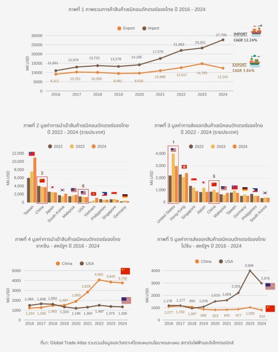 หากพิจารณาภาพรวมการค้าสินค้าเซมิคอนดักเตอร์ของไทย ปี 2016 - 2024 (ภาพที่ 1) พบว่า การนำเข้าเซมิคอนดักเตอร์ของไทยมีอัตราการเติบโตเฉลี่ยต่อปี (CAGR) ร้อยละ 12.24 โดยไทยนำเข้าสินค้าดังกล่าวเพื่อการประกอบ ทดสอบ และบรรจุ (Assembly, Testing, and Packaging) ก่อนที่จะประกอบรวมกับส่วนประกอบอิเล็กทรอนิกส์อื่น ๆ เป็นแผงวงจรรวม (PCBA) และผลิตภัณฑ์อิเล็กทรอนิกส์เพื่อส่งออกต่อไป ขณะที่ การส่งออกของไทยมีอัตราการเติบโตเฉลี่ยต่อปี (CAGR) ที่ร้อยละ 3.86 สาเหตุหลักมาจากการชะลอตัวของการส่งออกสินค้าโซลาร์เซลล์ โดยเฉพาะตลาดสหรัฐฯ ที่ใช้มาตรการภาษีตอบโต้การทุ่มตลาดและการอุดหนุน