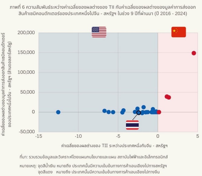 อย่างไรก็ตาม แม้ว่าดัชนี TII ของไทยจะบ่งชี้ถึงความเข้มข้นทางการค้ากับสหรัฐฯ ที่สูงกว่าจีน แต่ผลการวิเคราะห์จากแบบจำลอง Fixed Effects ในระดับโลกกลับพบว่าประเทศส่วนใหญ่มีแนวโน้มพึ่งพาจีนมากขึ้น ทั้งนี้ ความแตกต่างของการวิเคราะห์ดัชนี TII และแบบจำลอง Fixed Effects ไม่ได้สะท้อนถึงความไม่สอดคล้องของข้อมูล แต่แสดงถึงการวิเคราะห์ในมิติที่แตกต่างกัน โดย TII ของไทยเป็นตัวชี้วัดความเข้มข้นทางการค้าจริงจากข้อมูลในอดีต (Historical Data) จึงสะท้อนสถานะของไทยในระบบการค้าระหว่างประเทศในช่วง 9 ปีที่ผ่านมา (ปี 2016 - 2024) ว่ามีความแน่นแฟ้นกับจีนหรือสหรัฐฯ มากกว่ากัน ซึ่งจากการวิเคราะห์ พบว่า ไทยมีความสัมพันธ์ทางการค้ากับสหรัฐฯ ที่แน่นแฟ้นกว่าจีน เนื่องจากอุตสาหกรรมเซมิคอนดักเตอร์ของไทยมีห่วงโซ่อุปทานที่ผูกพันกับบริษัทสัญชาติอเมริกัน อีกทั้งสหรัฐฯ ยังเป็นตลาดเพื่อผลิตสินค้าขั้นปลายที่มีมูลค่าสูง โดยจากข้อมูลมูลค่าการค้าจาก Global Trade Atlas พบว่า ในปี 2024 ไทยมีมูลค่าการส่งออกสินค้าเซมิคอนดักเตอร์ไปยังสหรัฐฯ สูงกว่าจีนถึง 3.7 เท่า นอกจากนี้ ไทยยังได้มีนโยบายส่งเสริมการลงทุนให้แก่บริษัทต่างชาติ ซึ่งมีบริษัทสัญชาติอเมริกันบางแห่งได้ลงทุนในไทยในส่วนการผลิตชิ้นส่วนเฉพาะทาง ส่งผลให้สินค้าไทยที่ส่งออกไปยังสหรัฐฯ มีมูลค่าสูงกว่า ขณะที่ การวิเคราะห์แบบจำลอง Fixed Effects เป็นการวิเคราะห์แนวโน้มการเปลี่ยนแปลง (Forecast) ของการพึ่งพิงตลาดในระดับโลก ซึ่งสะท้อนถึงทิศทางและแนวโน้มในอนาคต โดยเมื่อค่า TII ในสินค้าเซมิคอนดักเตอร์ระหว่างไทยกับจีนเทียบกับสหรัฐฯ เพิ่มขึ้น 1 หน่วย จะมีความสัมพันธ์กับมูลค่าการส่งออกสินค้าเซมิคอนดักเตอร์ของไทยไปจีนที่เพิ่มขึ้น 0.5399 ล้านดอลลาร์สหรัฐ ภายใต้สมมติฐานที่ว่ามูลค่าการส่งออกสินค้าเซมิคอนดักเตอร์ของไทยไปสหรัฐฯ ไม่เปลี่ยนแปลง