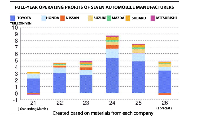 ผู้ผลิตรถยนต์นั่งส่วนบุคคลรายใหญ่ของญี่ปุ่นทั้ง 7 บริษัท ได้เปิดเผยประมาณการผลประกอบการรวมสำหรับปีงบประมาณ 2026 โดยพบว่า 6 บริษัทคาดว่ากำไรจากการดำเนินงานจะลดลง ขณะที่ Nissan Motor คาดว่าจะขาดทุนจากการดำเนินงาน
