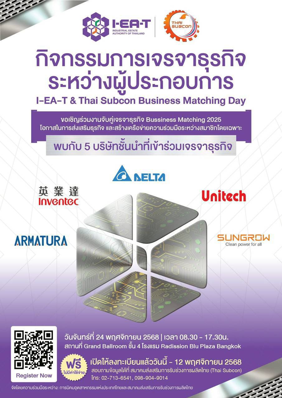 สมาคมส่งเสริมการรับช่วงการผลิตไทย (Thai Subcon) ร่วมกับ การนิคมอุตสาหกรรมแห่งประเทศไทย (กนอ.) ขอเชิญผู้ประกอบการภาคอุตสาหกรรมเข้าร่วมงาน “Business Matching 2025” เวทีจับคู่ธุรกิจระหว่างผู้ประกอบการไทยและบริษัทเทคโนโลยีระดับโลก 5 ราย ได้แก่ Delta Electronics, Sungrow Developers, Amatura Tech, Unitech PCB และ Inventec Electronics ซึ่งจะจัดขึ้นในวันที่ 24 พฤศจิกายน 2568 ณ โรงแรม Radisson Blu Plaza Bangkok เพื่อสร้างเครือข่ายทางธุรกิจและต่อยอดโอกาสการลงทุนในอุตสาหกรรมเทคโนโลยีและอิเล็กทรอนิกส์ของไทย