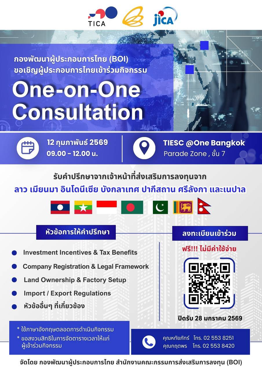 ผู้ประกอบการไทยที่สนใจขยายการลงทุนสู่ต่างประเทศ ห้ามพลาด! ขอเชิญเข้าร่วมกิจกรรม One-on-One Consultation โอกาสพิเศษในการพูดคุยและขอคำปรึกษาโดยตรงกับเจ้าหน้าที่ส่งเสริมการลงทุนจาก สาธารณรัฐประชาธิปไตยประชาชนลาว เมียนมา อินโดนีเซีย บังกลาเทศ ปากีสถาน ศรีลังกา และเนปาล เพื่อเปิดมุมมองการลงทุนใหม่ ๆ และสร้างความเข้าใจเชิงลึกเกี่ยวกับสภาพแวดล้อมทางธุรกิจ กฎหมาย และสิทธิประโยชน์ด้านการลงทุนในแต่ละประเทศ