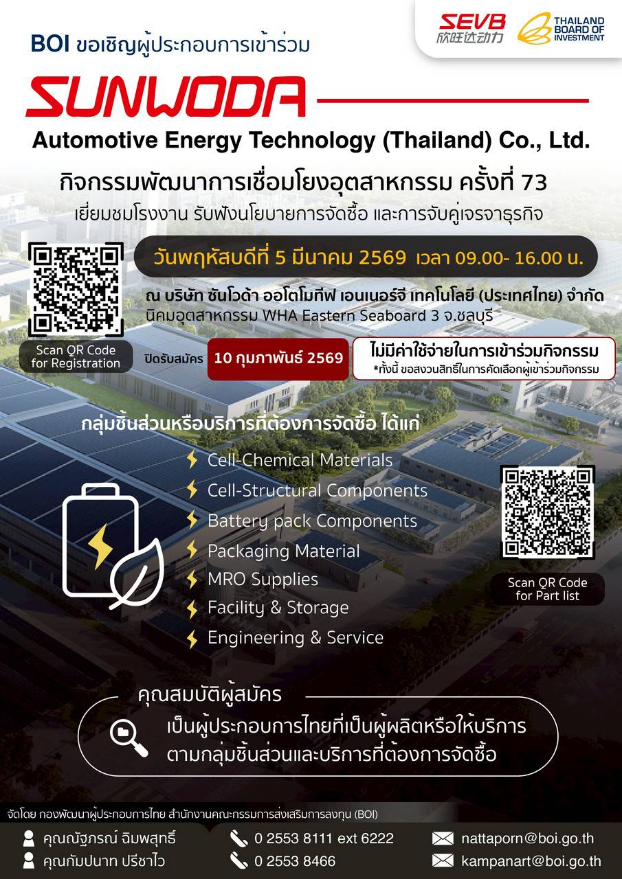 สำนักงานคณะกรรมการส่งเสริมการลงทุน (BOI) ร่วมกับ บริษัท ซันโวด้า ออโตโมทีฟ เอนเนอร์จี เทคโนโลยี จำกัด (Sunwoda Automotive Energy Technology) จัดกิจกรรมพัฒนาการเชื่อมโยงอุตสาหกรรม ครั้งที่ 73 เพื่อเปิดโอกาสให้ผู้ประกอบการไทยเข้าสู่ซัพพลายเชนอุตสาหกรรมยานยนต์ไฟฟ้าและแบตเตอรี่ระดับโลก ผ่านการเรียนรู้แนวทางการจัดซื้อ การเยี่ยมชมกระบวนการผลิต และกิจกรรมจับคู่ธุรกิจโดยตรง โดยมีกำหนดจัดขึ้นในวันที่ 5 มีนาคม 2569 ณ นิคมอุตสาหกรรม WHA Eastern Seaboard 3 จังหวัดชลบุรี