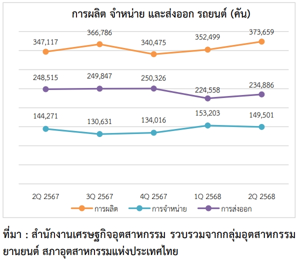 ในไตรมาสที่ 2 ปี 2568 มีจำนวน 373,659 คัน เพิ่มขึ้นจากไตรมาสที่ 1 ปี 2568 ร้อยละ 6.00 (%QoQ) และเพิ่มขึ้นจากไตรมาสเดียวกันกับปีก่อน ร้อยละ 7.65 (%YoY) โดยมีสัดส่วนแบ่งเป็น การผลิตรถยนต์นั่ง ร้อยละ 38 รถกระบะ 1 ตันและอนุพันธ์ ร้อยละ 61 และรถยนต์เพื่อการพาณิชย์อื่น ๆ ร้อยละ 1