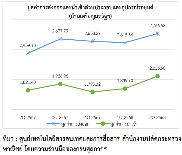 มูลค่าการส่งออกของส่วนประกอบและอุปกรณ์รถยนต์ ในไตรมาสที่ 2 ปี 2568 มีมูลค่า 2,766.58 ล้านเหรียญสหรัฐฯ เพิ่มขึ้นจากไตรมาสที่ 1 ปี 2568 ร้อยละ 5.78 (%QoQ) และเพิ่มขึ้นจากไตรมาสเดียวกันของปีก่อนร้อยละ 13.43 (%YoY) โดยตลาดส่งออกที่สำคัญของ